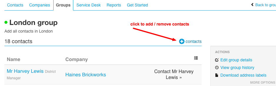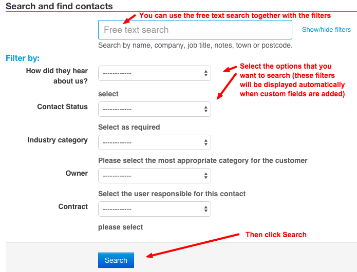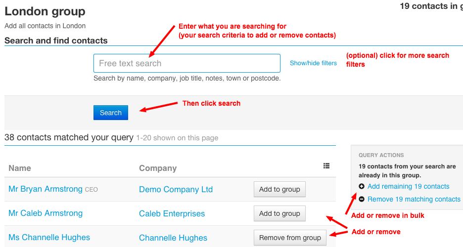 Search in groups / add or remove Bryce Anderson 25 April 2015 09:43 Follow Click on +Contacts Enter your search criteria in free text search (optional) Click on Show/hide filters Then click search Bulk add or remove contacts (optional) add or remove contacts individually (optional) select a filter Click on Search Comments